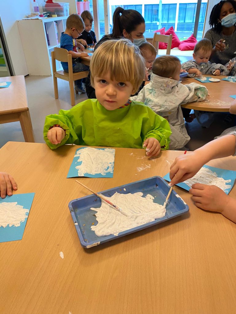 Cette semaine, les Trotteurs ont participé à deux activités bricolage. Ils ont créé des ours polaires avec de la ouate et décoré la porte du calendrier de l’avent : une activité avec de la peinture et de la farine mélangées pour que la texture soit différente.